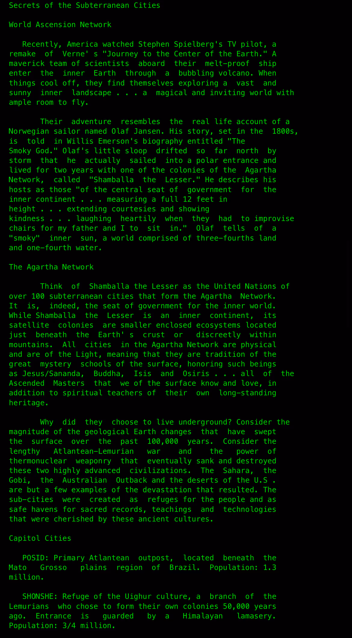 1. North Pole First proposed by John Cleves Symmes Jr. Described as a vast polar opening leading into the Earth’s interior. Often imagined as navigable by sea or air. 2. South Pole / Antarctica Later amplified through 20th-century Antarctic expeditions and Cold War secrecy. Associated with Richard E. Byrd in postwar conspiracy narratives. 3. Antarctica Interior (Beyond the Poles) Distinct from the pole itself — imagined as hidden valleys, ice-free zones, or subterranean access points deep within the continent. 4. Mount Shasta (California) Linked to Lemurians, ancient survivors, and ascended beings. A key New Age / esoteric entry point rather than a polar one. 5. Tibet / Himalayas Associated with Agartha and Shambhala. Entry framed as spiritual, restricted, or accessible only to initiates. 6. Giza Plateau — Temple of Isis (Egypt) Connected to ancient knowledge, underworld passages, and sacred geometry. Often cited as a ceremonial or symbolic gateway rather than a physical tunnel. 7. South America (Amazon / Andes region) Linked to lost civilizations and subterranean cities. Appears in both colonial-era myths and modern conspiracy mapping. 8. Eastern Europe / Inner Asia (Caucasus–Altai zone) A recurring location in esoteric maps connecting Eurasian myth, ancient migrations, and underground networks. 9. Oceanic Entrances Submerged access points beneath the oceans — trenches, caverns, or “pressure-sealed” passages. Often used to explain UFOs or unidentified submersible phenomena.